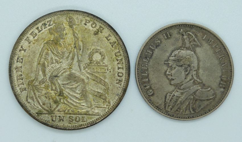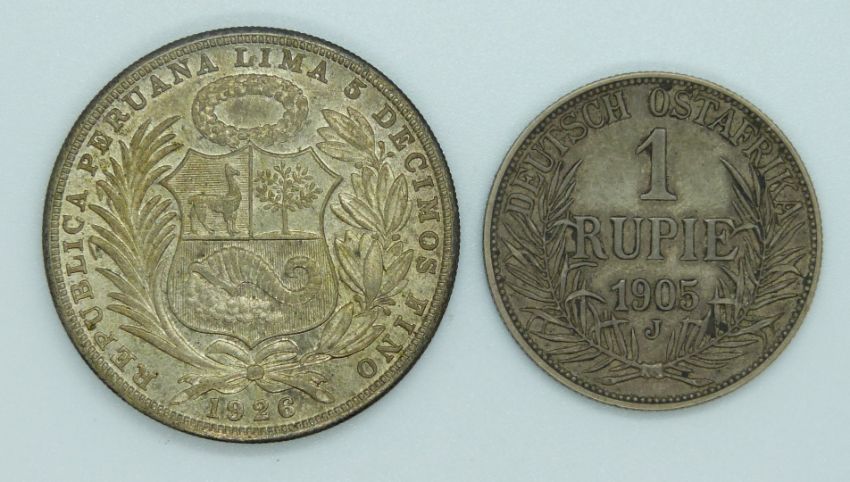 Wilhelm II 1905 German East African silver one Rupie, together with a 1928 Peru 1 sol