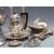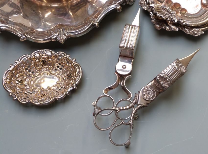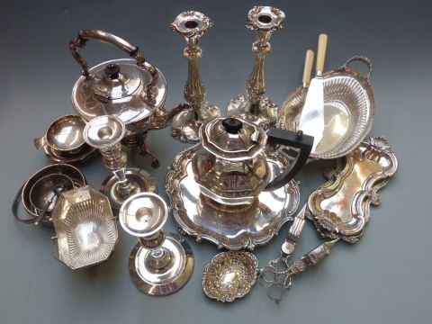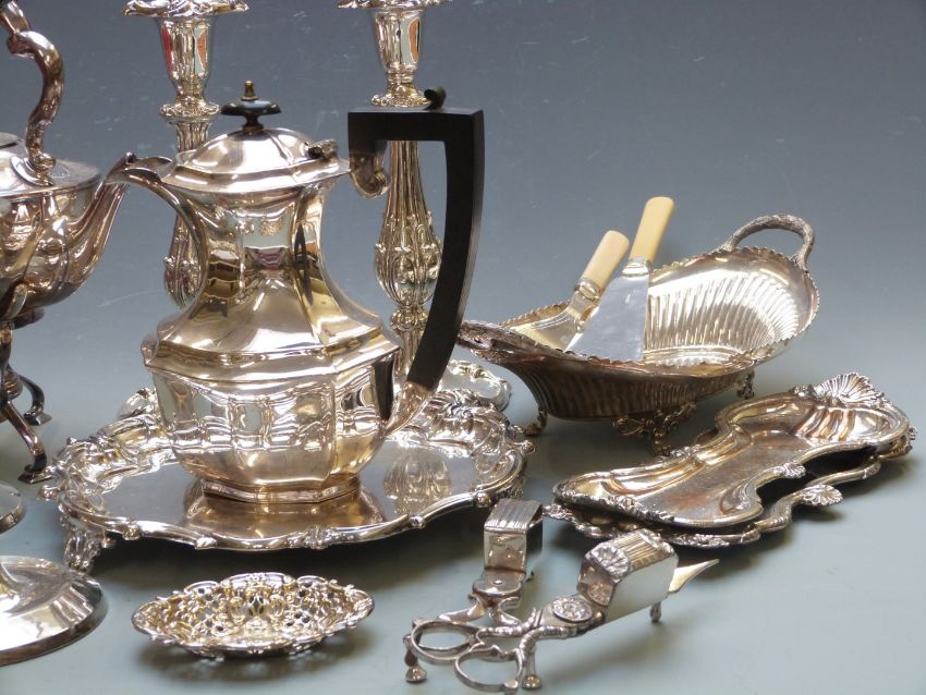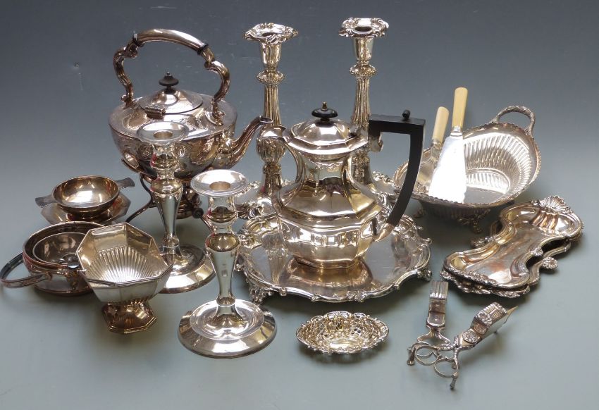 Plated ware including two pairs of candlesticks, height of tallest 25.5cm, spirit kettle, Walker & Hall twin handled basket, Mappin & Webb salver, diameter 26cm, teaware, cutlery and wick trimmers on trays