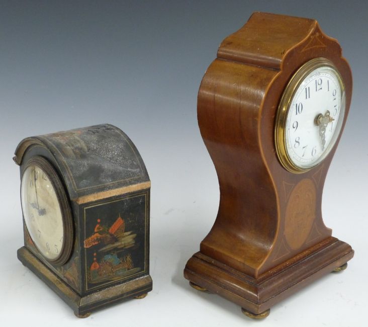 19thC French mantel clock in a lacquered oriental design case together with a balloon style clock in inlaid case, tallest 25cm