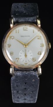 Garrard 9ct gold gentleman's wristwatch with inset subsidiary seconds dial, gold hands and Arabic numerals, silver dial and 17 jewel movement, on brown leather strap, case diameter 34mm.