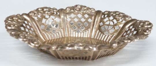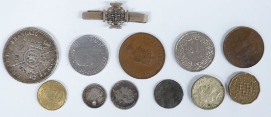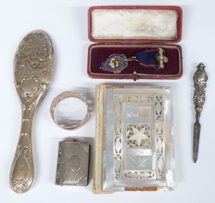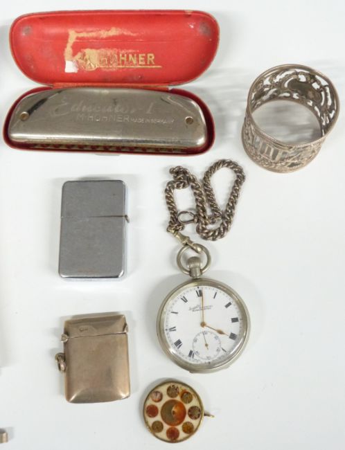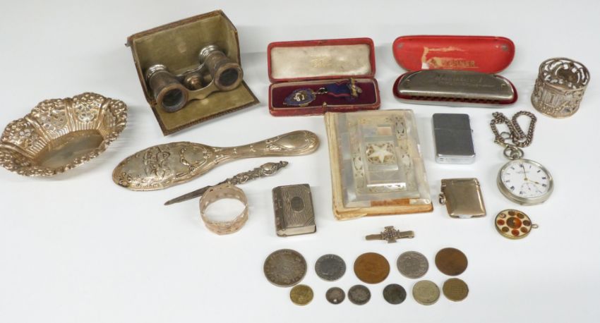 Hall marked silver pierced bonbon dish, length 13.5cm, Edward VII hallmarked silver napkin ring, Sheffield 1909 and hallmarked silver vesta, weight of three items 72g, hallmarked silver brush back, plated vesta and Everite pocket watch, Hohner Educator harmonica, opera glasses, hallmarked silver gilt Oddfellows jewel, mother of pearl 'Bethlehem' bible, 1869 Napoleon III 5F coin etc