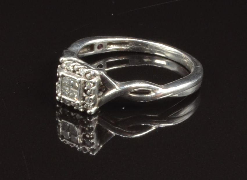 A white metal ring set with four square cut diamonds surrounded by round cut diamonds, size J, 2.1g