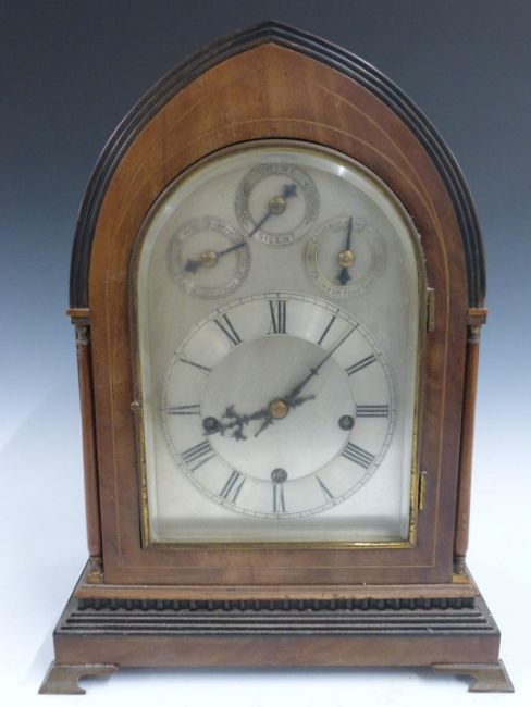 W and H Winterhalder and Hofmeier c1900 mitre case mantel clock, quarter striking on eight or four bells, the silvered dial and chapter ring with three secondary dials to indicate the settings, three train movement, 39cm tall