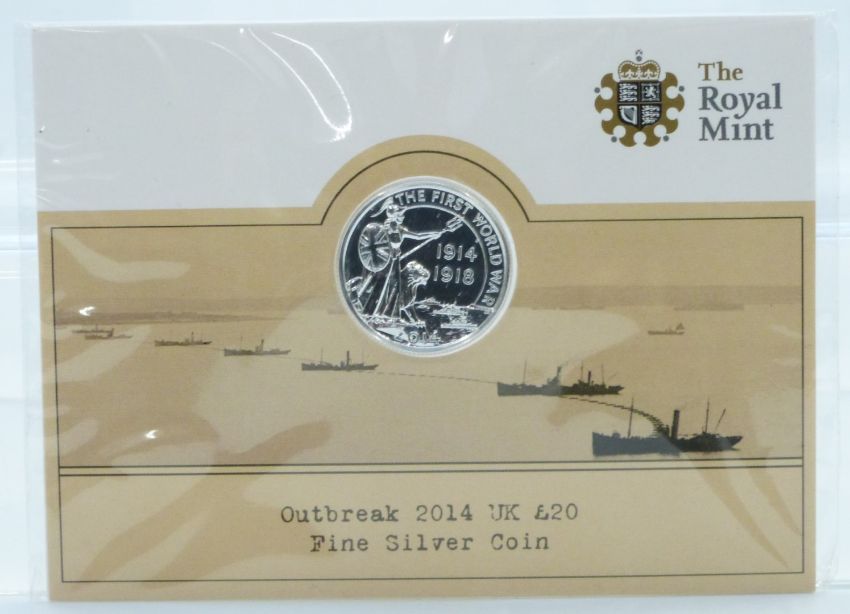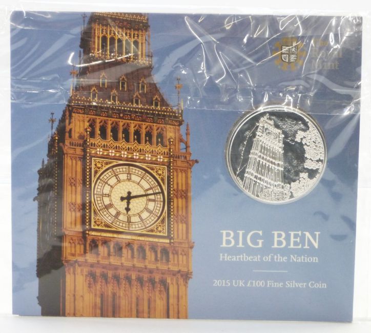 Royal Mint 2015 Big Ben Heartbeat of the Nation UK £100 fine silver coin, together with a 2014 Outbreak of WW1 £20 fine silver coin, both in presentation packs