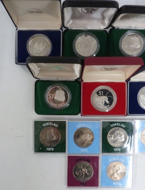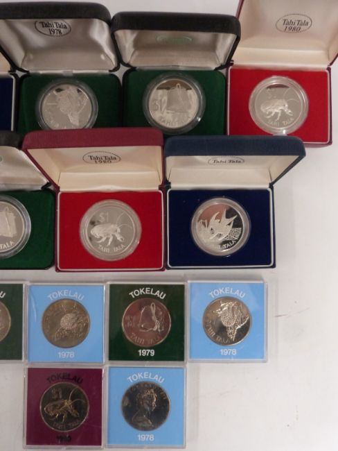 Seven cased silver proof Tokelau one Tala coins, Elizabeth II, includes pineapple, fishing bucket and coconut crab, together with six cupro-nickel examples in perspex cases, 1978, 1979, 1980, 1981
