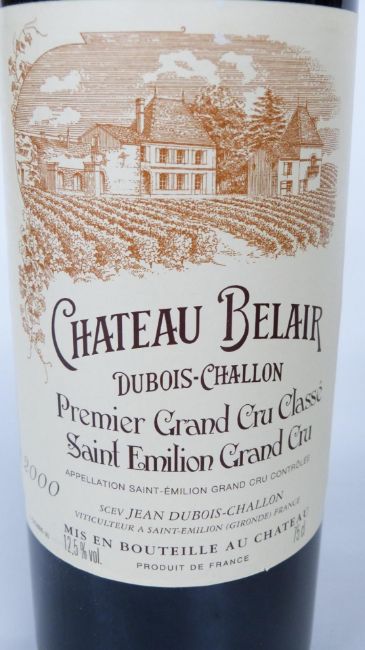 Six bottles of Chateau-Belair 2000 Saint Emilion Grand Cru red wine 75cl 12.5% vol. This lot has been stored 'en primeur' by the Wine Society on behalf of the vendor.