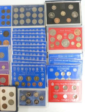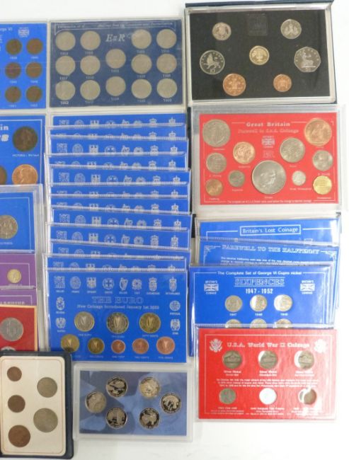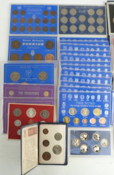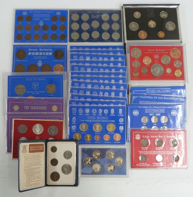 A collection of UK and other coin sets including 1987 cased example, but mostly in flat or presentation packs, together with 12 Euro eight coin sets
