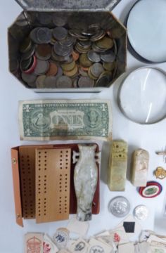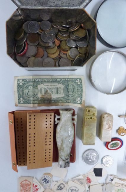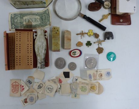 Collectables including seals, compass, badges, cut printed and embossed letterheads from notable organisations, coins etc