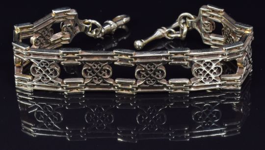 A 9ct gold watch chain/ bracelet made up of unusual pierced links, 30.7g