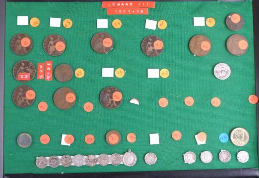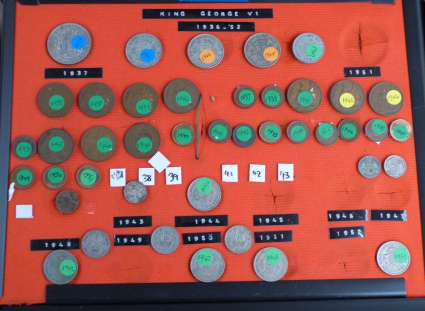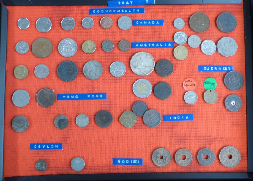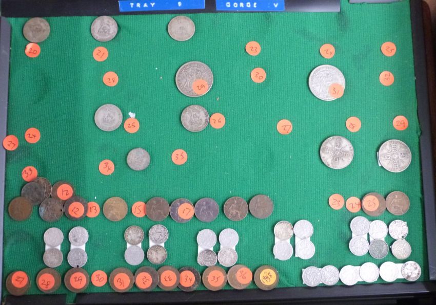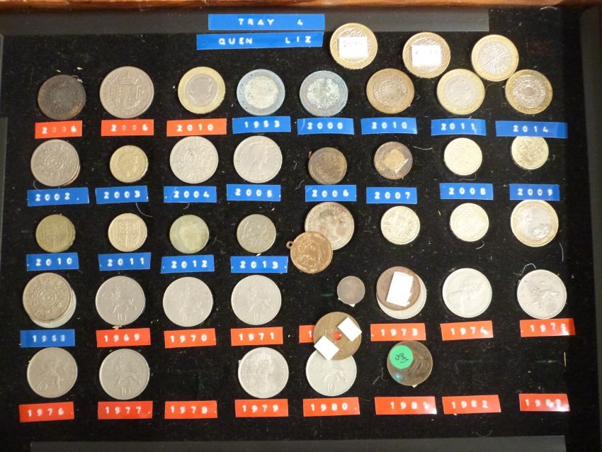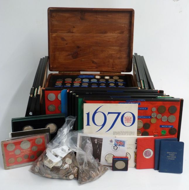 A large collection of UK coinage including collectable £2, 50p etc and some redeemable examples, George III onwards, contained in a wooden box and displayed on trays and a further quantity including some overseas, small silver content, coin sets etc