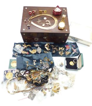 A collection of jewellery including brooches, Sarah Coventry necklace and cufflinks, Carven brooch, marcasite necklaces, silver locket, cufflinks, etc in inlaid wooden box