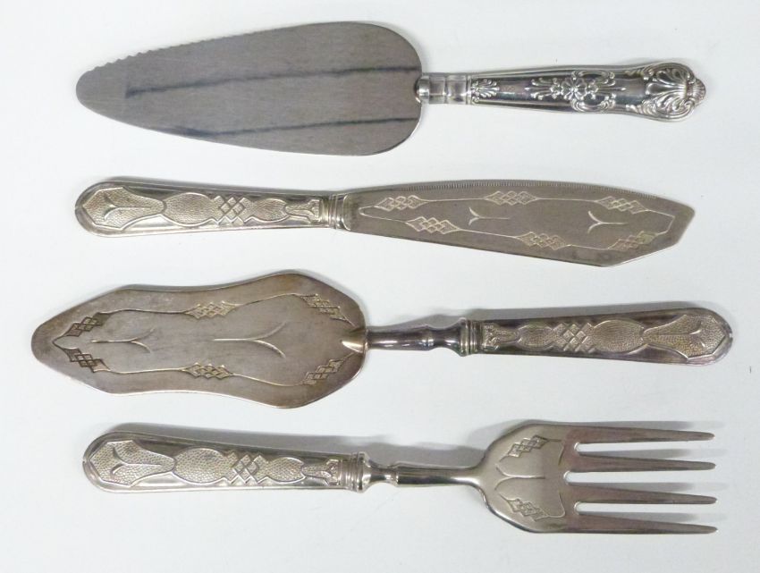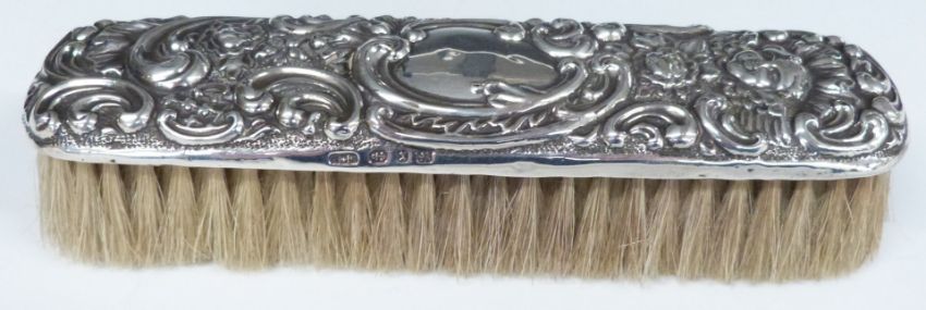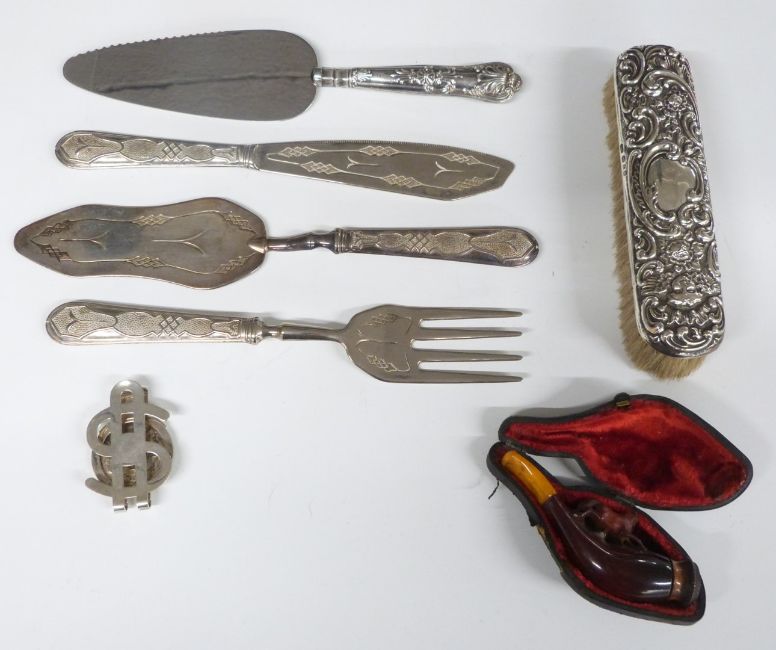 1889 Liberty dollar mounted in a money clip marked sterling, weight 47g, hallmarked silver handled king's pattern cake slice, hallmarked silver backed brush, cased Meerschaum pipe etc