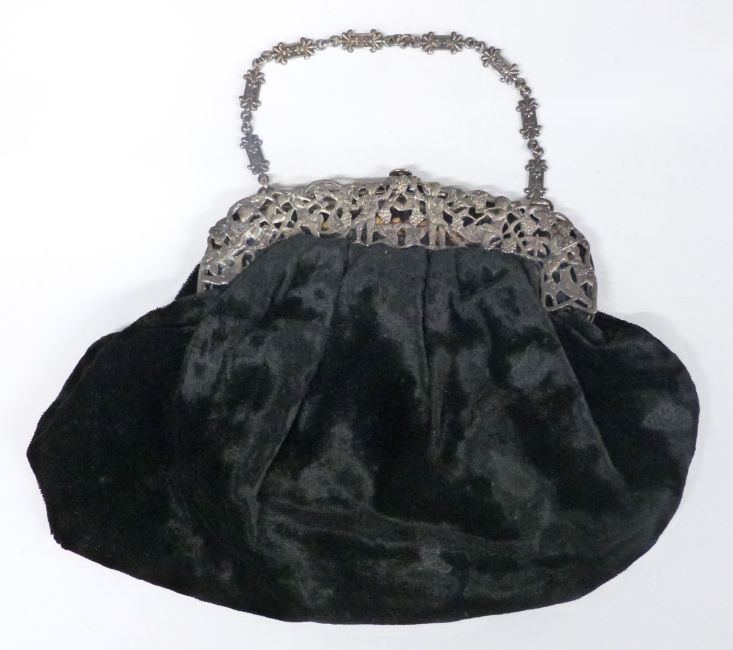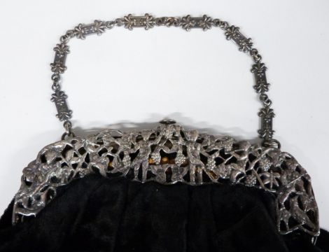 Victorian hallmarked silver mounted ladies evening bag with pierced decoration, London 1900, maker's mark indistinct but possibly M&Co. width of silver mount 16cm