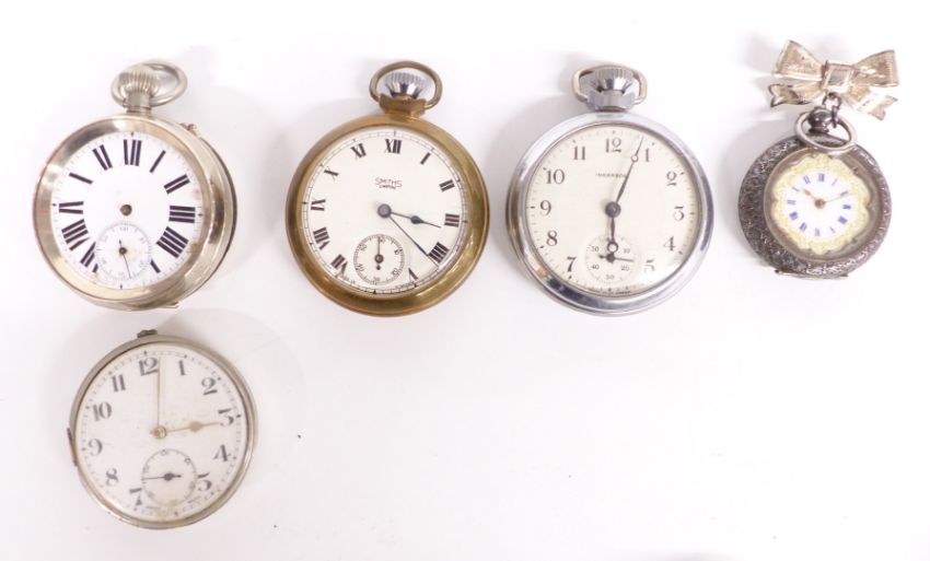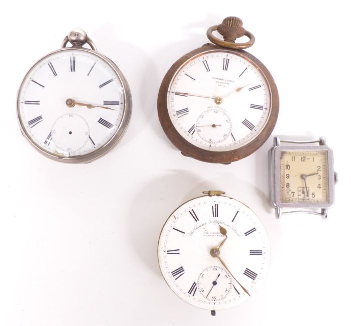 Six various pocket and wristwatches including a hallmarked silver example by Frederick Barnard of Sheerness with fusee movement, Smiths, Edward & Sons Glasgow etc, together with watch spares, and a collection of watch and clock keys including J B Yorkley, G Langford of Chertsey, Deane & Co of Londonderry, Baker of Cheltenham etc.