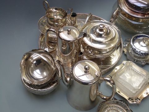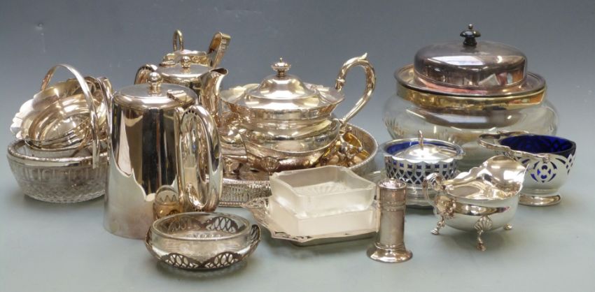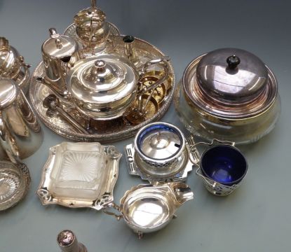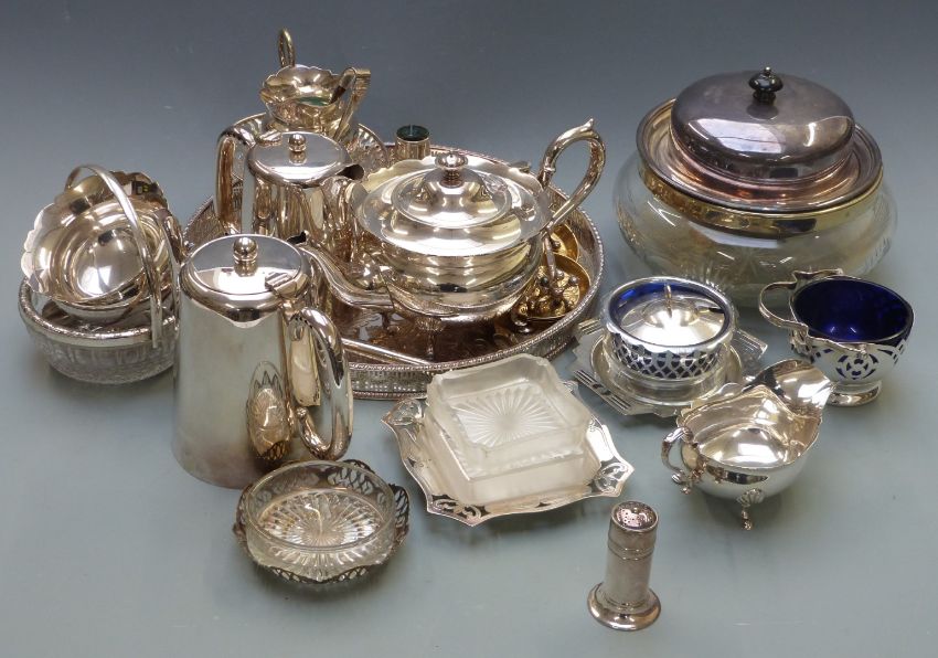 Silver plated ware to include galleried circular tray, tea ware and sauce boat