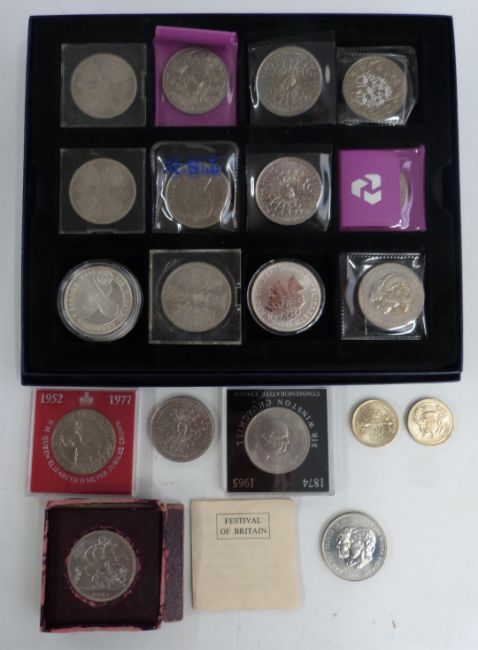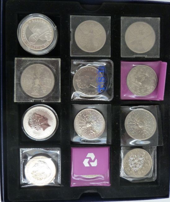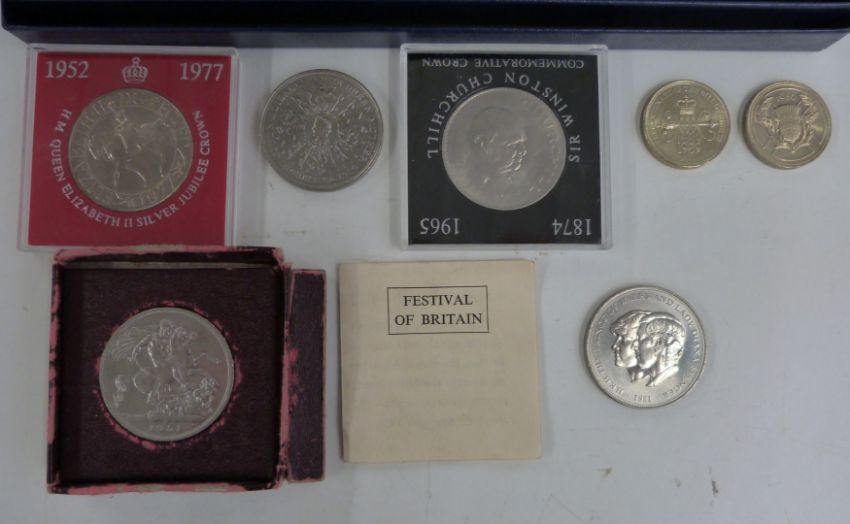 Silver proof Jersey £5 crown, silver Britannia 2006, a collection of modern crowns 1951 onwards, £2 coins etc, in Westminster box
