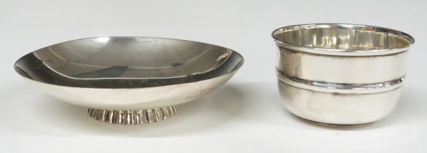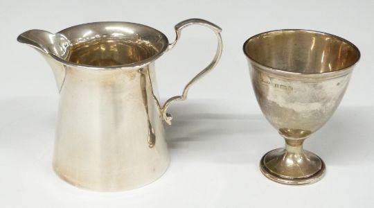Hallmarked silver jug, egg cup and bowl together with a shallow footed bowl marked Sterling silver, diameter 10cm, weight 164g all in