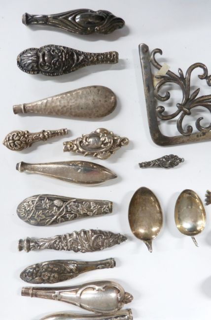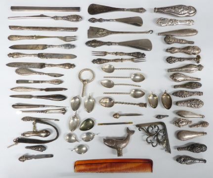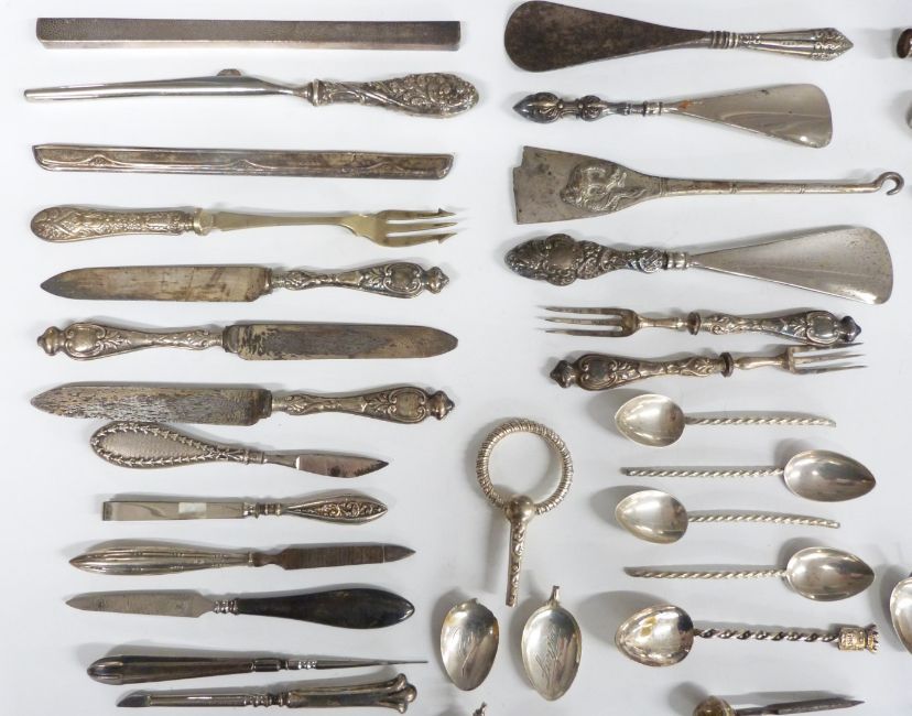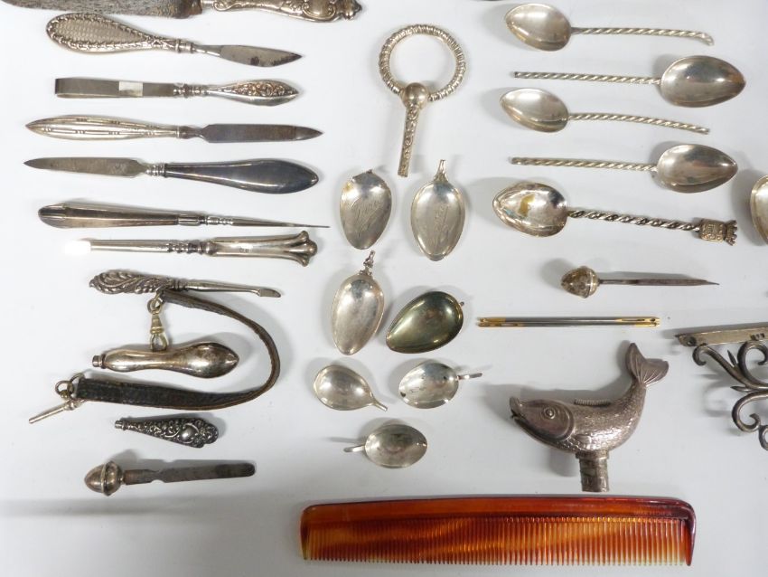Quantity of hallmarked silver handled items, mounts, plated spoons and various collectables