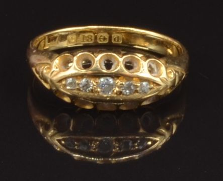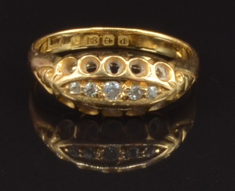 Edwardian 18ct gold ring set with diamonds in a boat shaped setting, Birmingham 1904, size O, 4.3g