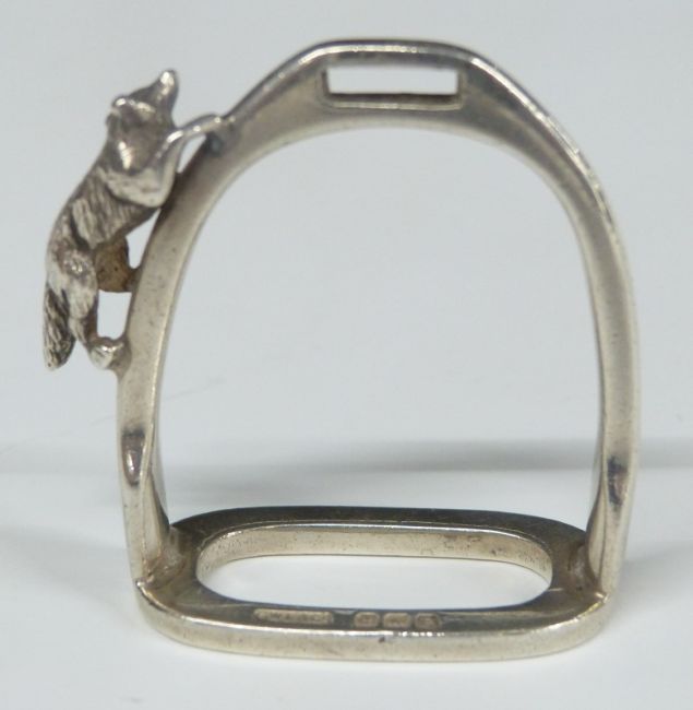 George VI novelty hallmarked silver miniature stirrup with fox, likely a napkin ring, Birmingham 1939, maker G W Lewis & Co, height 4.5cm, weight 28g