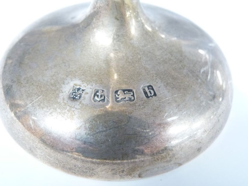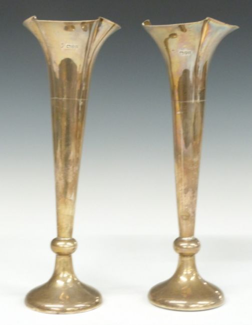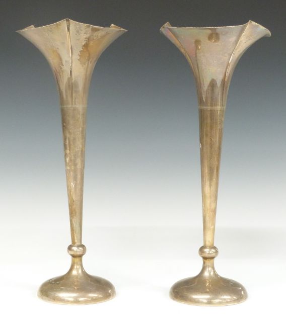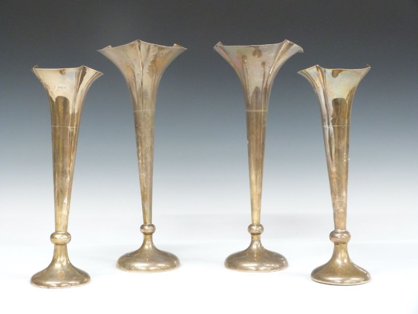 Two pairs of hallmarked silver trumpet vases, one pair Birmingham 1901, maker A & J Zimmerman Ltd the others Chester 1904, maker George Nathan & Ridley Hayes, height of tallest 27cm