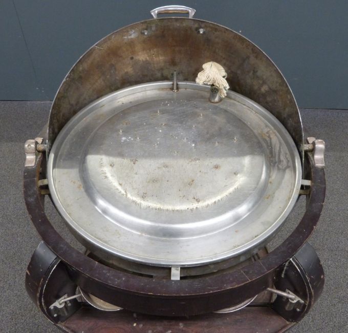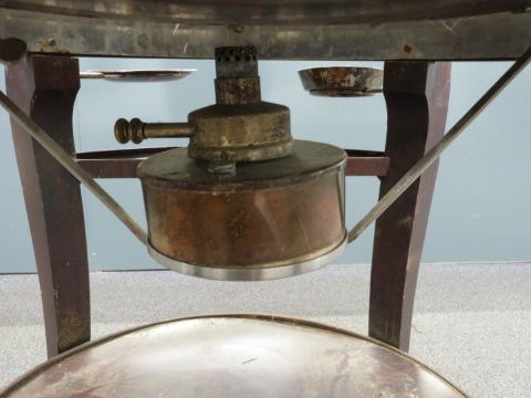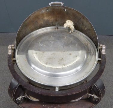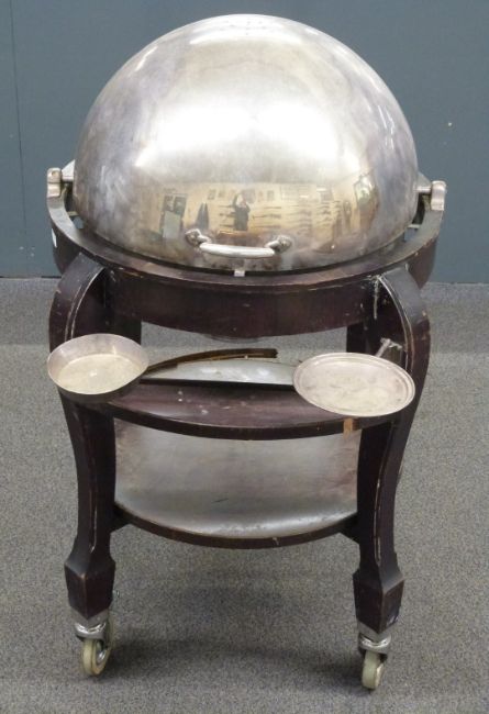 Silver plated meat serving trolley with revolving lid, spirit burner, swivel trays and undershelf, raised on cabriole legs and wheels, H122 x D87cm