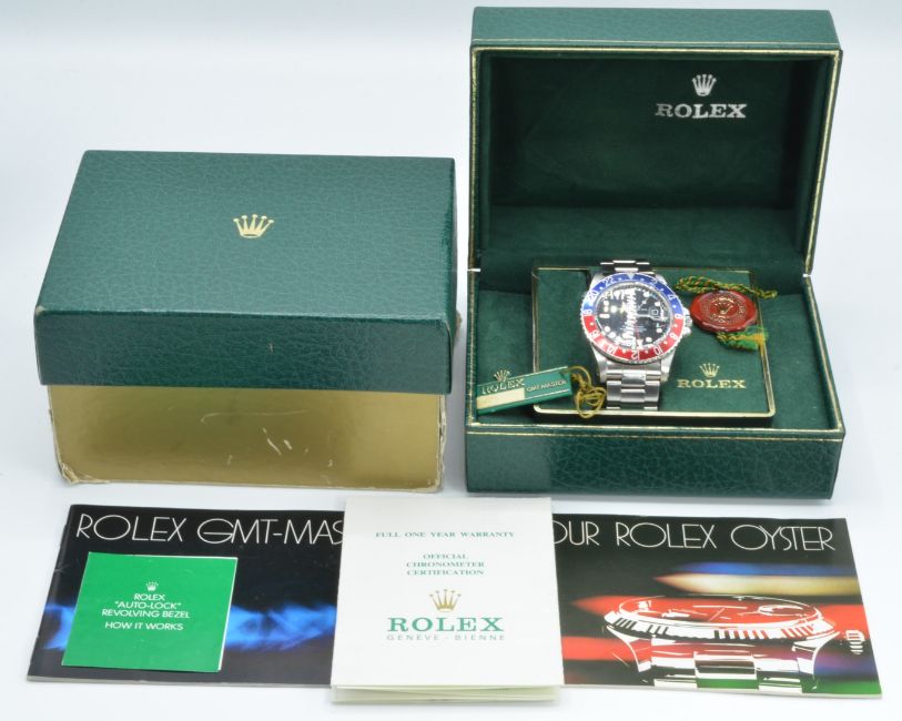 Rolex GMT Master gentleman's diver's/ pilots automatic wristwatch ref. 16750 with date aperture, blue and red hand rotating 24 hour 'Pepsi' bezel, black dial, luminous hands and hour markers, stainless steel case and signed 27 jewel calibre 3075 movement, on steel bracelet, case diameter 40mm, serial number 8333426, 1984, in original box with tags, guarantee, related paperwork and outer box.
