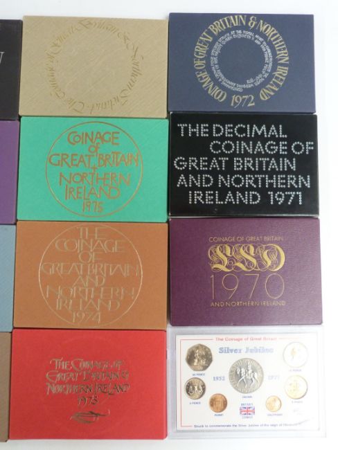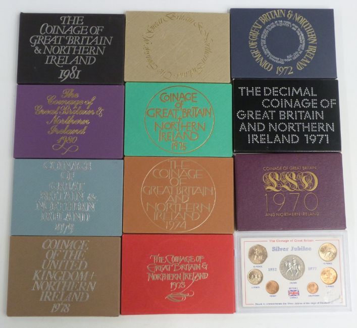 Eight Royal Mint proof UK coin sets in perspex cases with certificates, 1970-1981