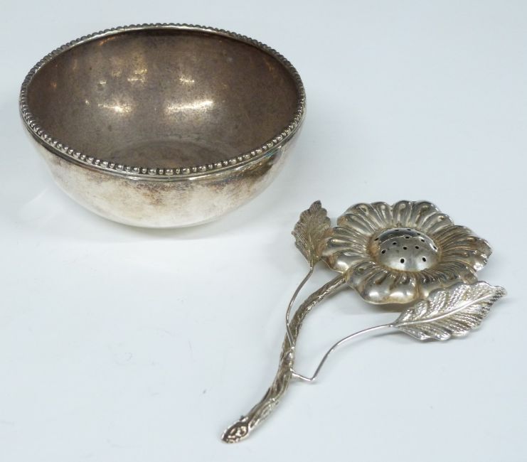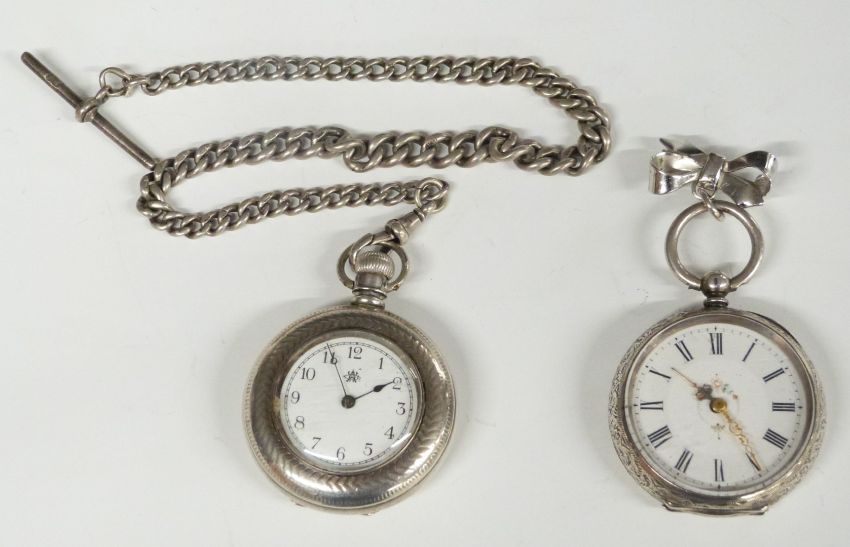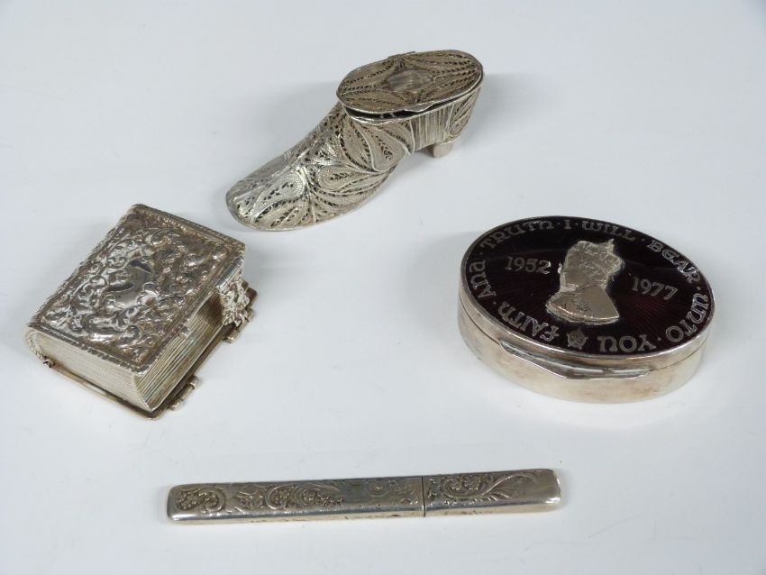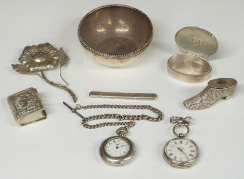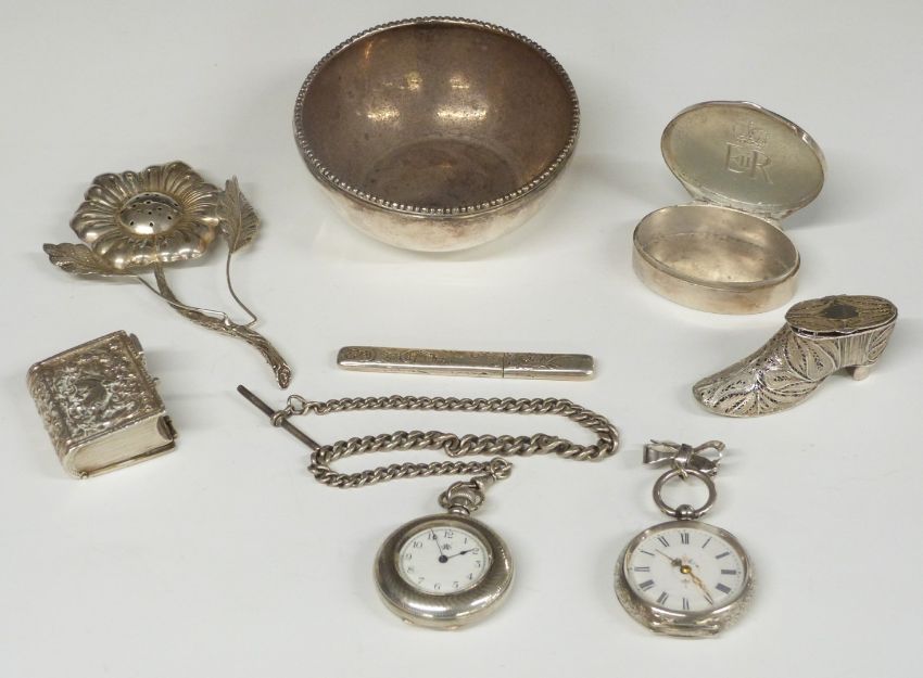 Hallmarked silver bowl, limited edition feature hallmarked trinket box with red enamel decorated lid, white metal filigree shoe, white metal flower marked 800, weight 171g all in, together with two white metal pocket watches and a graduated hallmarked silver chain
