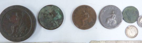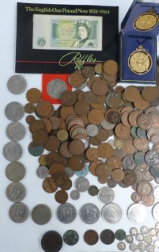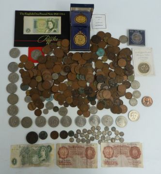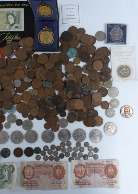 An amateur collection of UK and overseas coinage, banknotes and modern crowns, including a bronze Churchill coin, George III and an Irish example, some silver content including threepenny bits, Victorian onwards etc