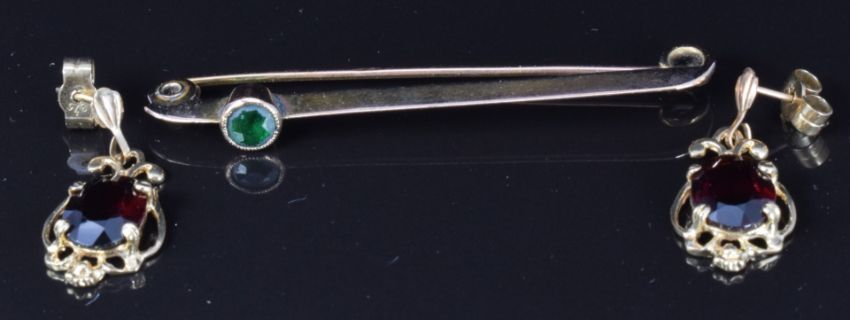 A pair of 9ct gold earrings set with garnets and a bar brooch, 5.4g