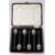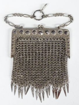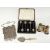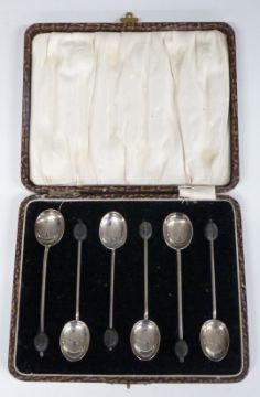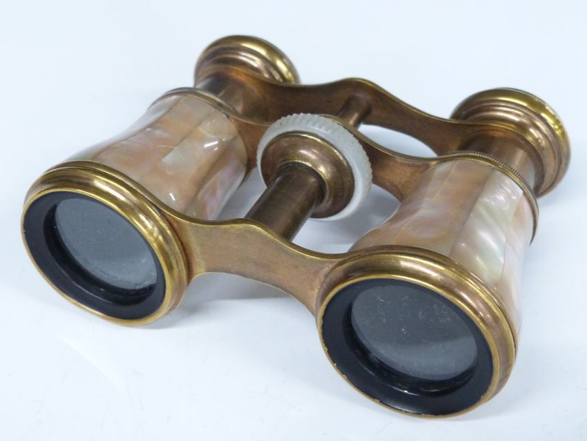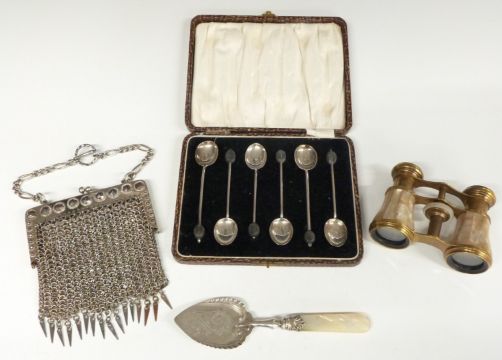 Cased set of hallmarked silver coffee bean spoons, weight 41g all in, Victorian hallmarked silver mother-of-pearl handled spoon, Birmingham 1900, maker William Devenport, opera glasses and a cut steel bag