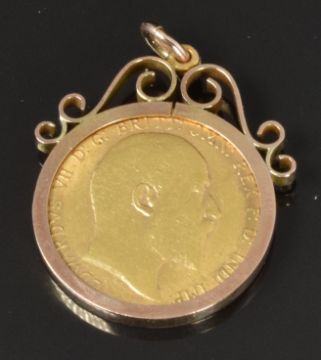 A 1909 full gold sovereign in 9ct gold pendant mount, 10.1g