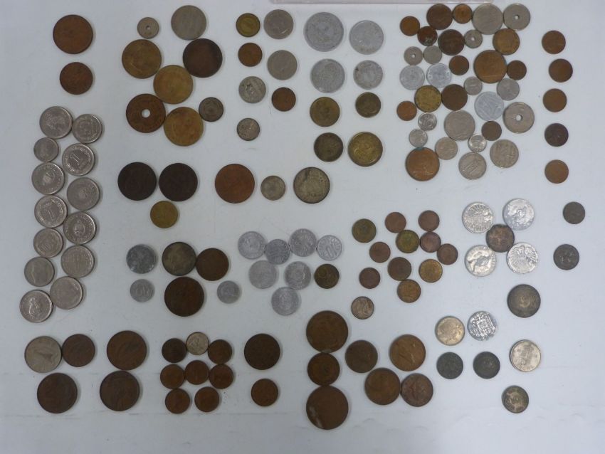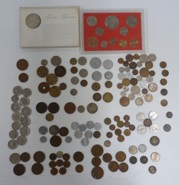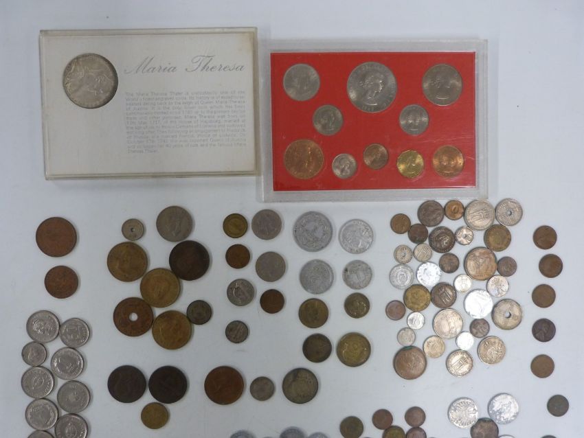 Maria Theresa silver coin and further world coinage, in a vintage tin
