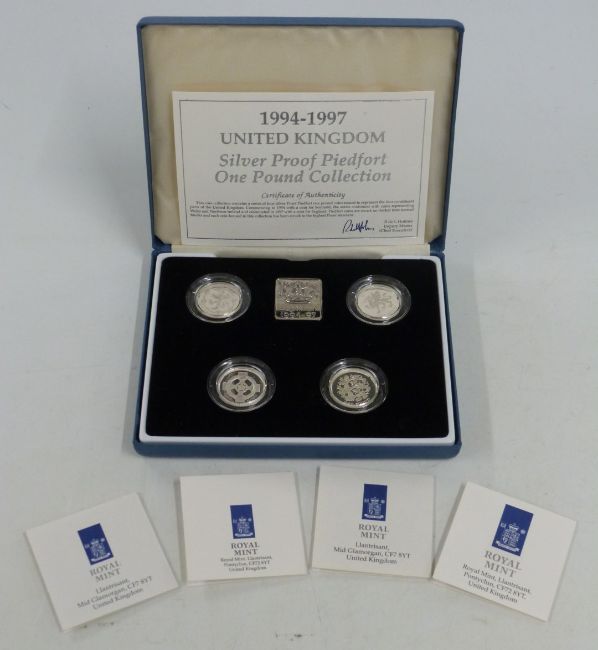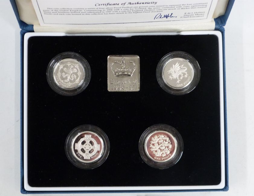 Royal Mint 1994-1997 UK silver proof Piedfort £1 collection comprising England, Scotland, Ireland and Wales, with display ingot and certificates, in fitted case