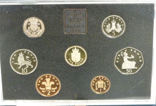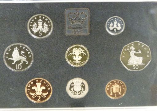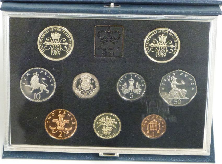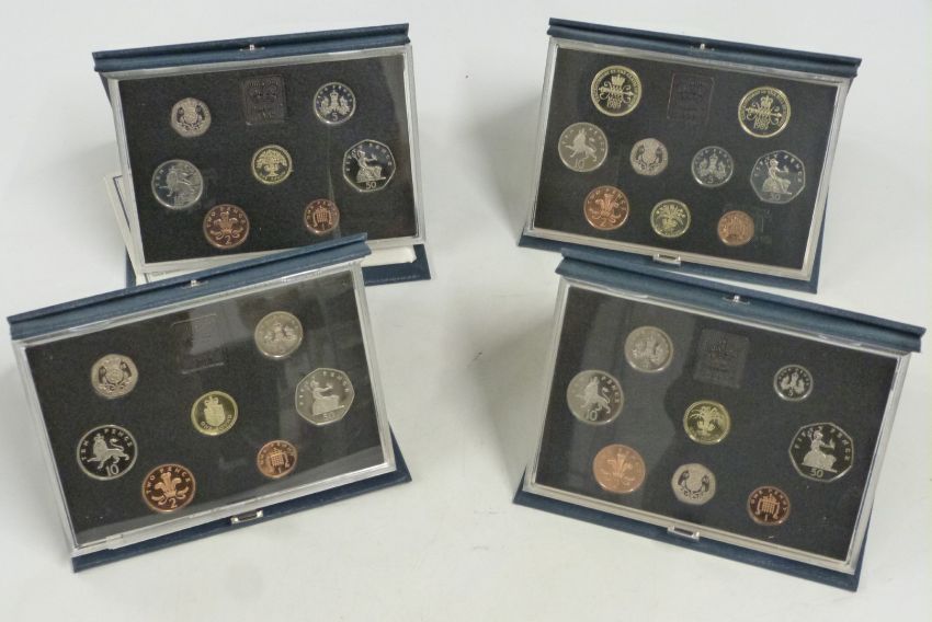 Royal Mint UK proof coin sets  for 1987, 1988, 1989 and 1990, in deluxe cases with certificates