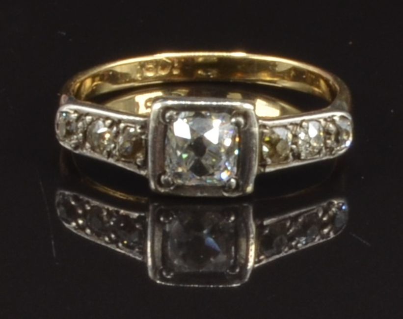 Victorian 18ct gold ring set with an old cut diamond of approximately 0.4ct and with further diamonds to the shoulders, size M, 2.6g