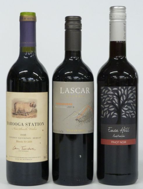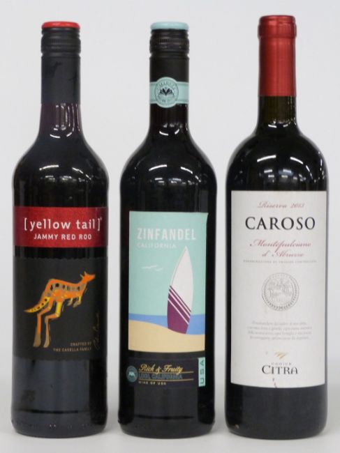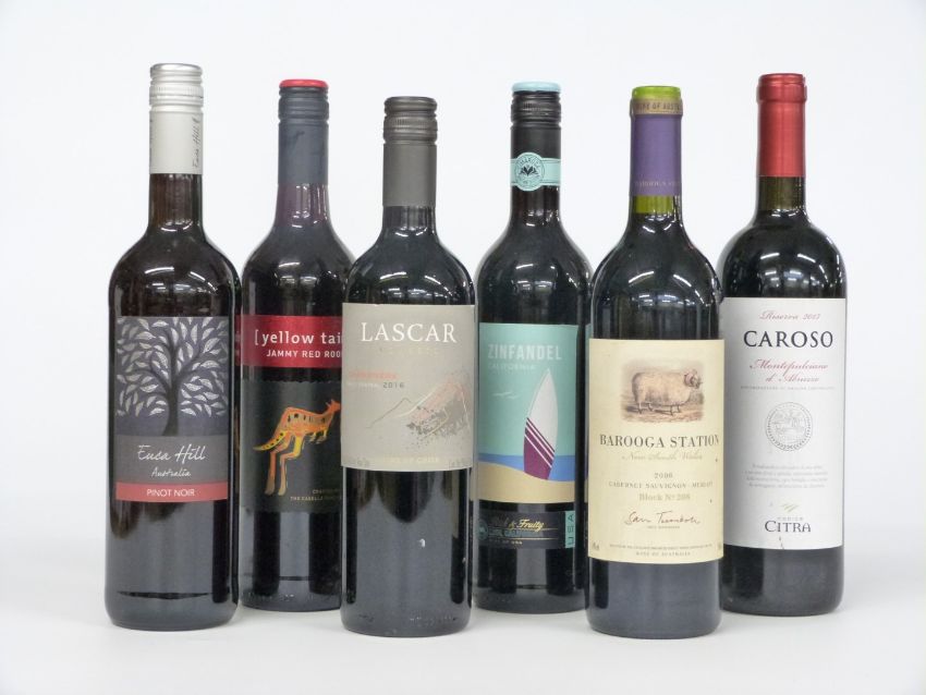 Six bottles of New World and Italian red wines comprising Euca Hill Pinot Noir 2013 13.5% Vol, Barooga Station Block No.208 2006 14% vol, Yellow Tail Jammy Red Roo 12% vol, Zinfandel California 2013 14% vol, Caroso Reserva 2013 14% and Lascar Classic 2016 13% vol, all 75cl