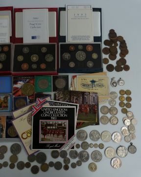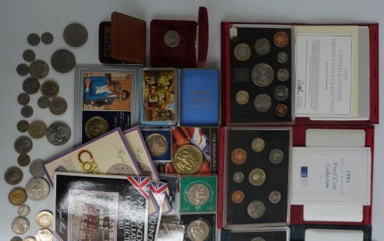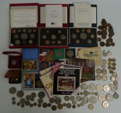 A collection of various modern crowns, Royal Mint UK coin sets, £2 coins etc, small silver content to include two silver snooker medals / watch fobs