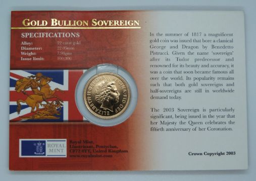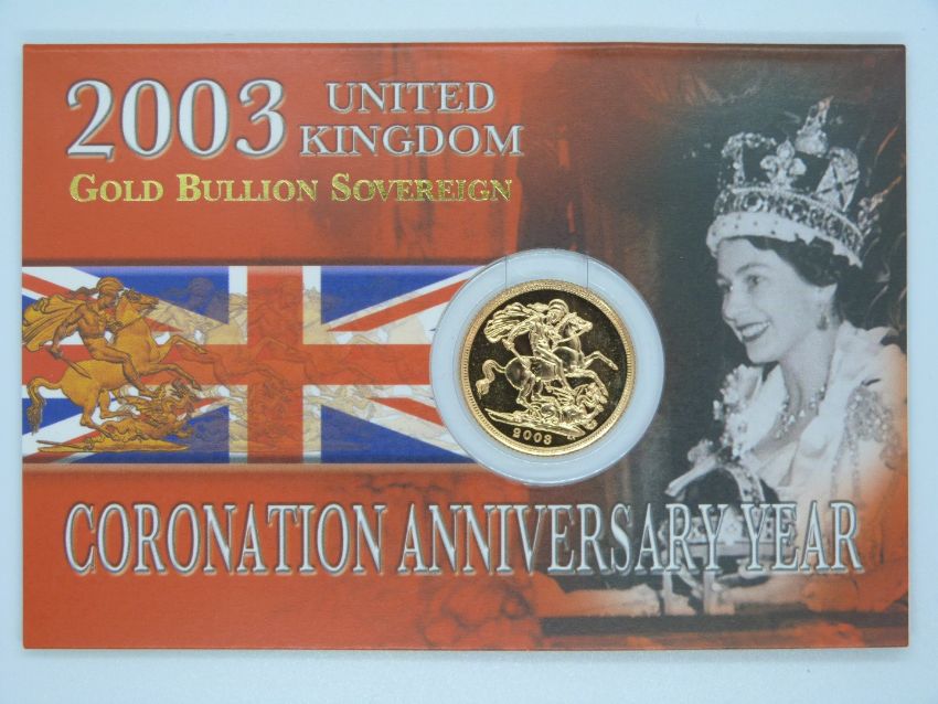 2003 gold full sovereign in Royal Mint Gold Bullion Coronation Anniversary Year presentation pack