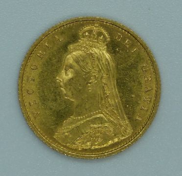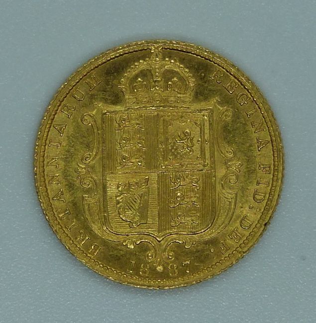 1887 Queen Victoria gold half sovereign, Jubilee head, shield reverse