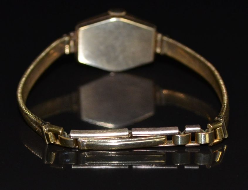 Victor 9ct gold ladies wristwatch with gold hands and Arabic numerals, silver dial, bevelled case and signed 17 jewel movement, on rolled gold bracelet, case diameter 16mm, serial number 50218.