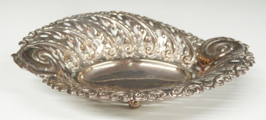 Pair of Walker & Hall Victorian hallmarked silver pierced and embossed bonbon dishes, raised on four feet, Birmingham 1900, length 13.5cm, weight 86g