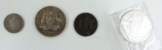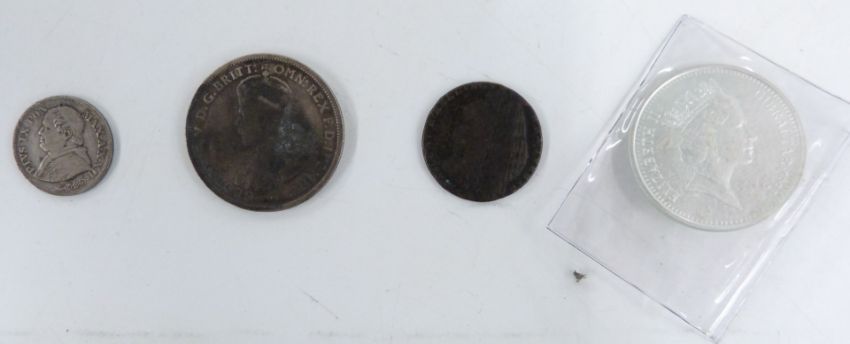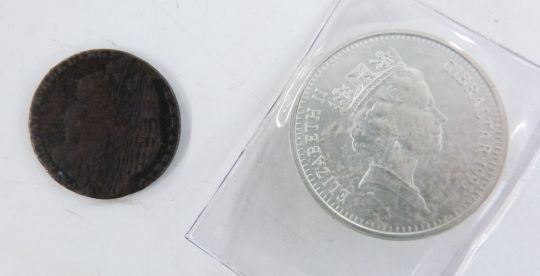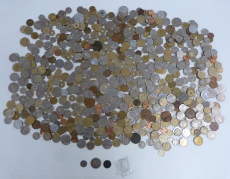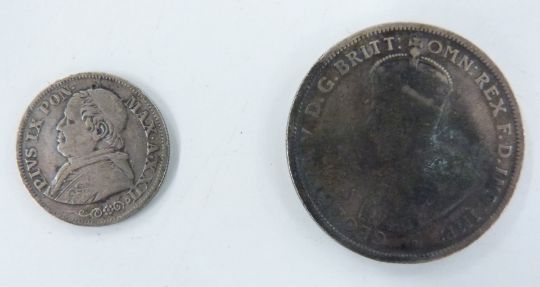 A tin containing a collection of overseas coinage, largely pre-Euro holiday change, but also includes a couple of pre-1920 examples, 1868 ten soldi Pius Ix, 1916 Australian one florin and an 1802 Gibraltar one quart token