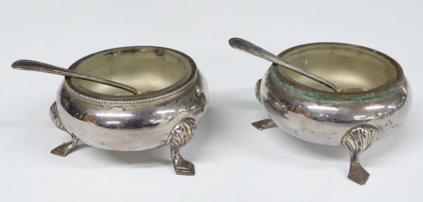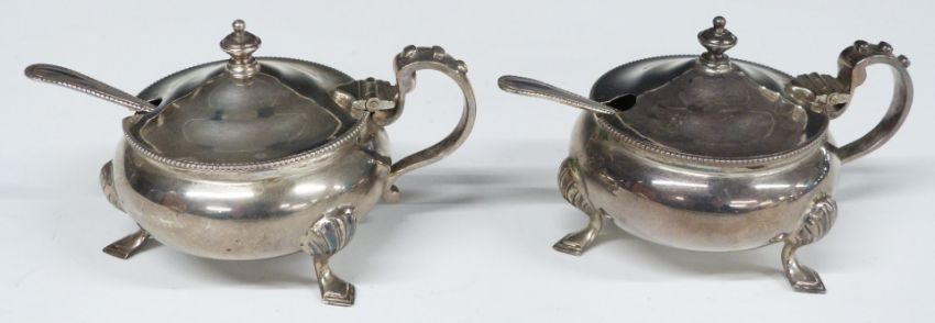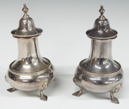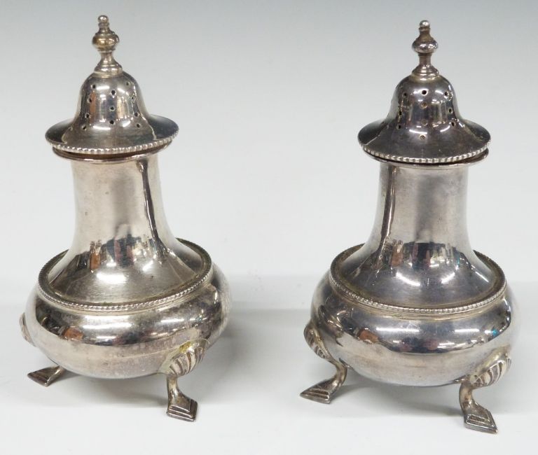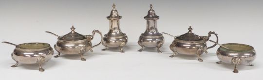 Edward VIII hallmarked silver six piece cruet set comprising two each of pepper, open salt and mustard, together with four spoons, Sheffield 1936, maker William Hutton & Sons Ltd, height of peppers 9cm, weight of silver 387g