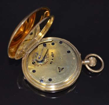 H Samuel of Manchester 18ct gold keyless winding full hunter chronograph or doctor's pocket watch with blued centre seconds hand, gold hour and minutes hands, black Roman numerals, stepped white enamel dial and signed movement, case diameter 50mm, serial number 36117, with original purchase receipt dated 1919, 133g