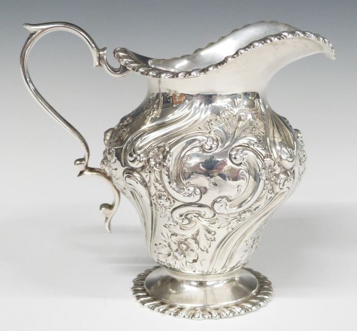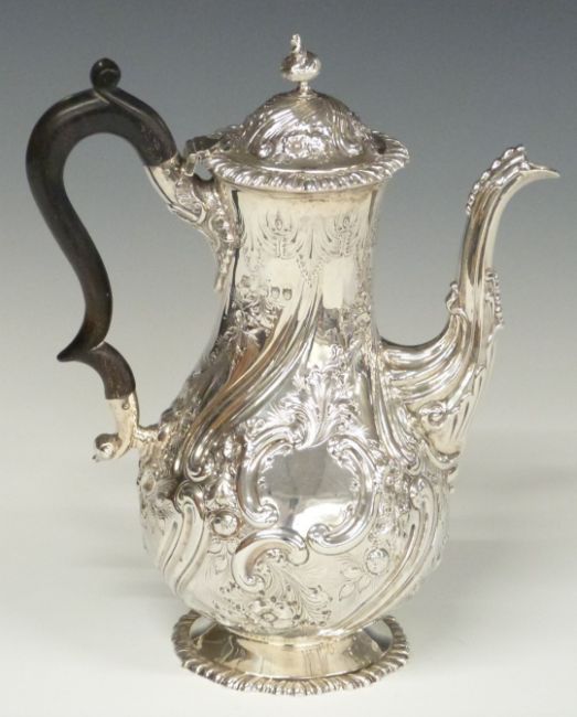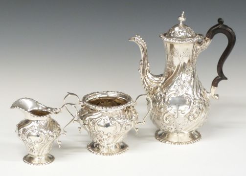 Victorian hallmarked silver three piece tea or coffee set with embossed decoration, London 1893/1899, maker Mappin Brothers/Gibson & Co Ltd, height of tallest 26cm, weight 1350g all in