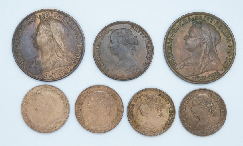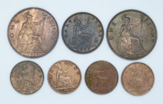 Victorian halfpenny 1865 uncirculated, together with four farthings 1886,1875 H, 1895 and 1880, all VF, two veiled head pennies 1895 and 1898, EF with lustre