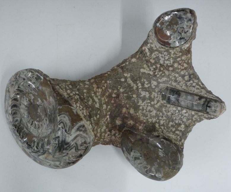 Large multiple fossil sample with polished / highlighted ammonites, length 39 x width 28cm