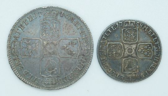 George II 1746 half crown LIMA under bust NONO to edge, toned, together with a 1758 shilling plain angles (2)
